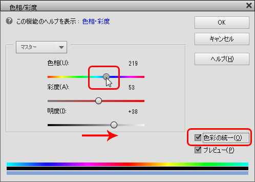 「色相」のスライダーを動かすと色合いを変えることができます。